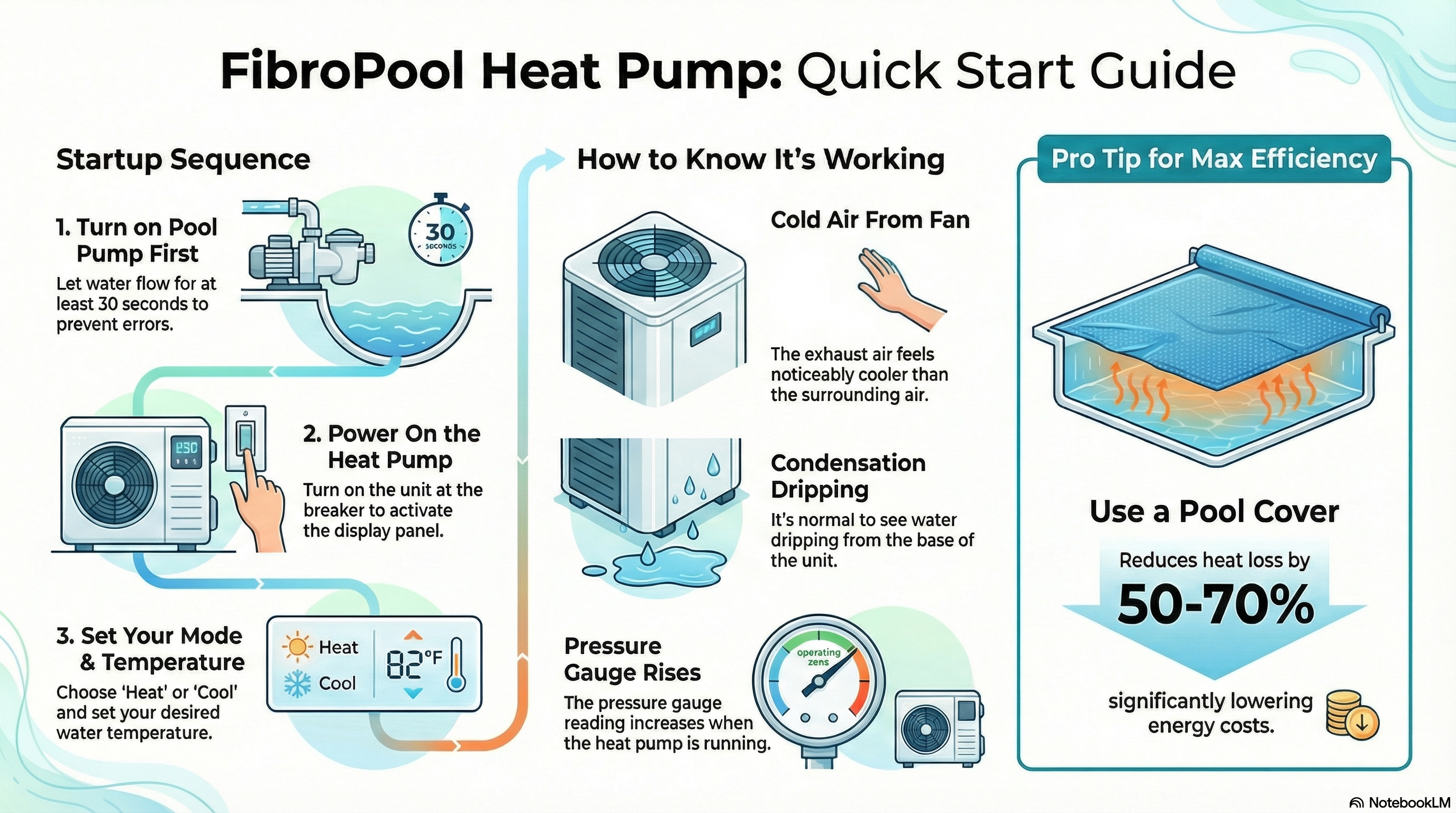 Once your FibroPool heat pump is installed, daily use is simple and rewarding. Our heat pumps will keep your pool warm (or cool) with less energy and cost. This guide covers startup, controls, modes, and how to know it's working right